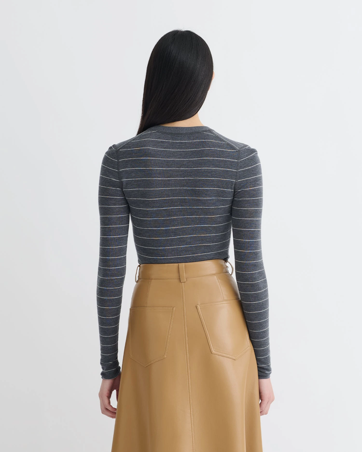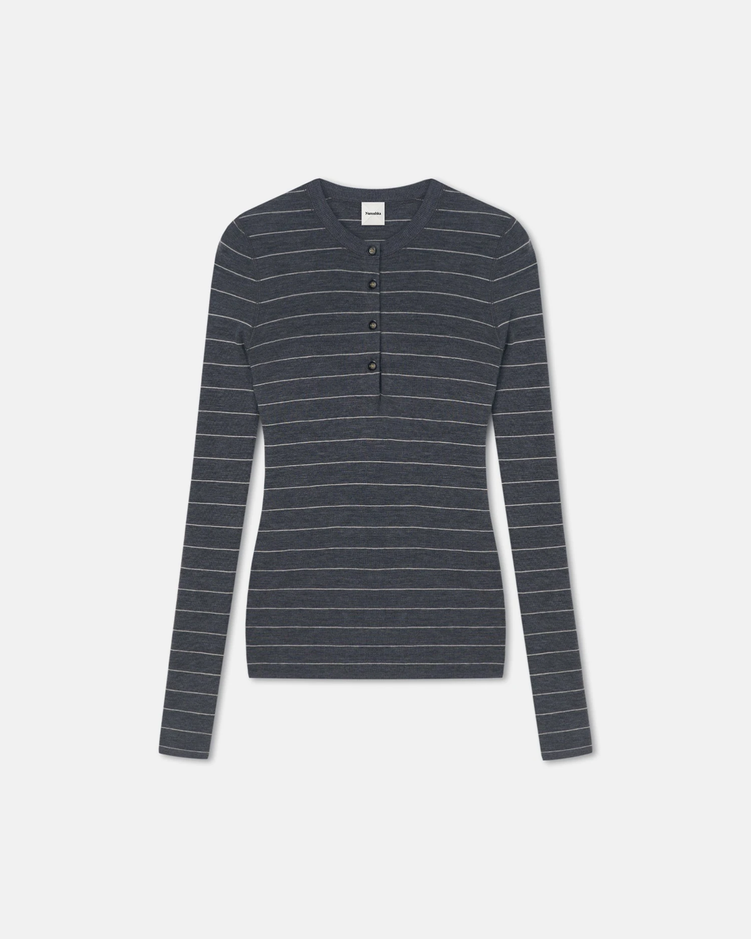The Ariyah top takes inspiration from sports aesthetics. Made from super-soft terry merino, it has fine grey stripes and a henley silhouette.
