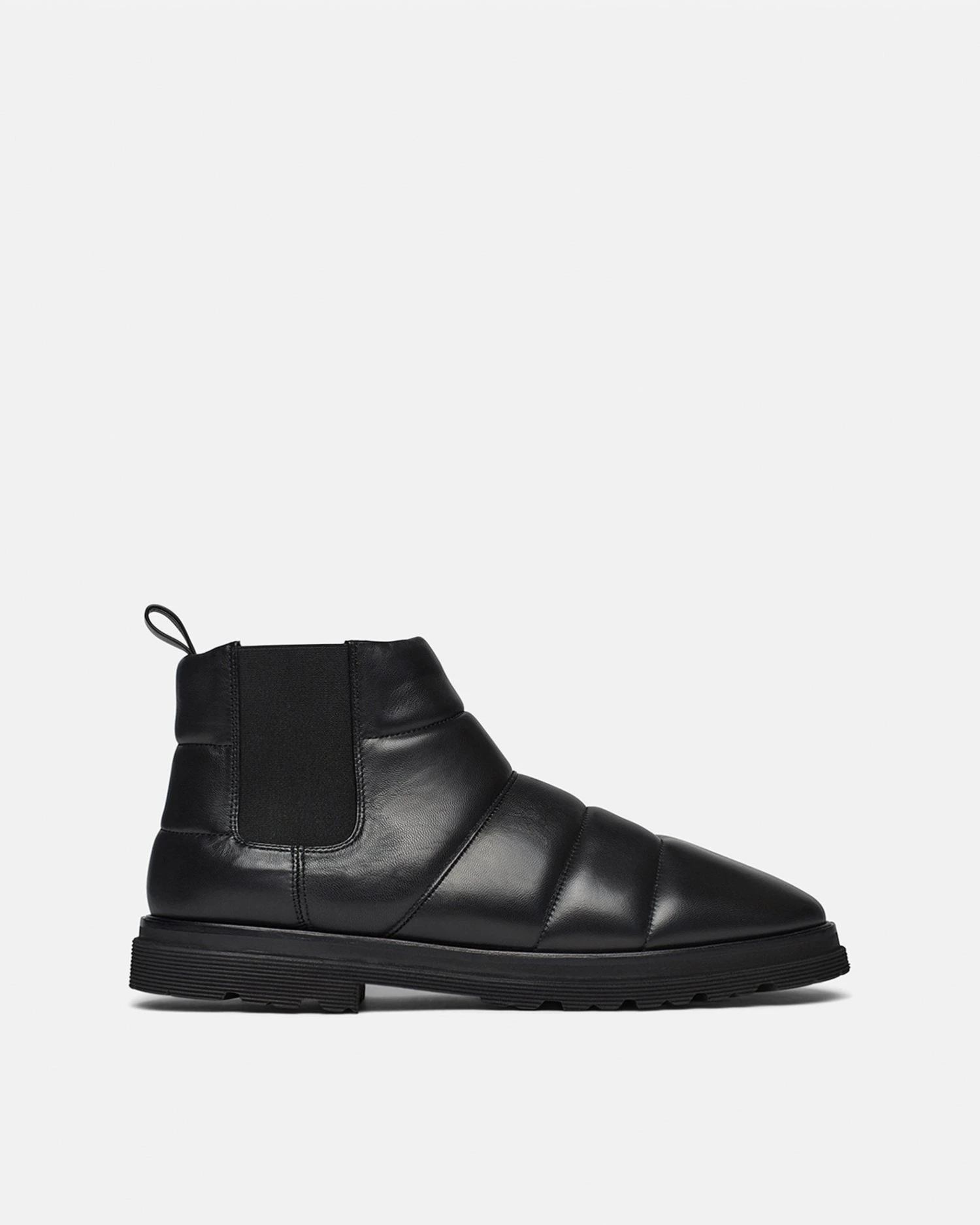 Black padded nappa leather gives the Bede boots a contemporary feel. Grounded with a heavy tread sole and finished with a rounded toe, elasticated sides and pull tabs allow for pull-on, kick-off ease.