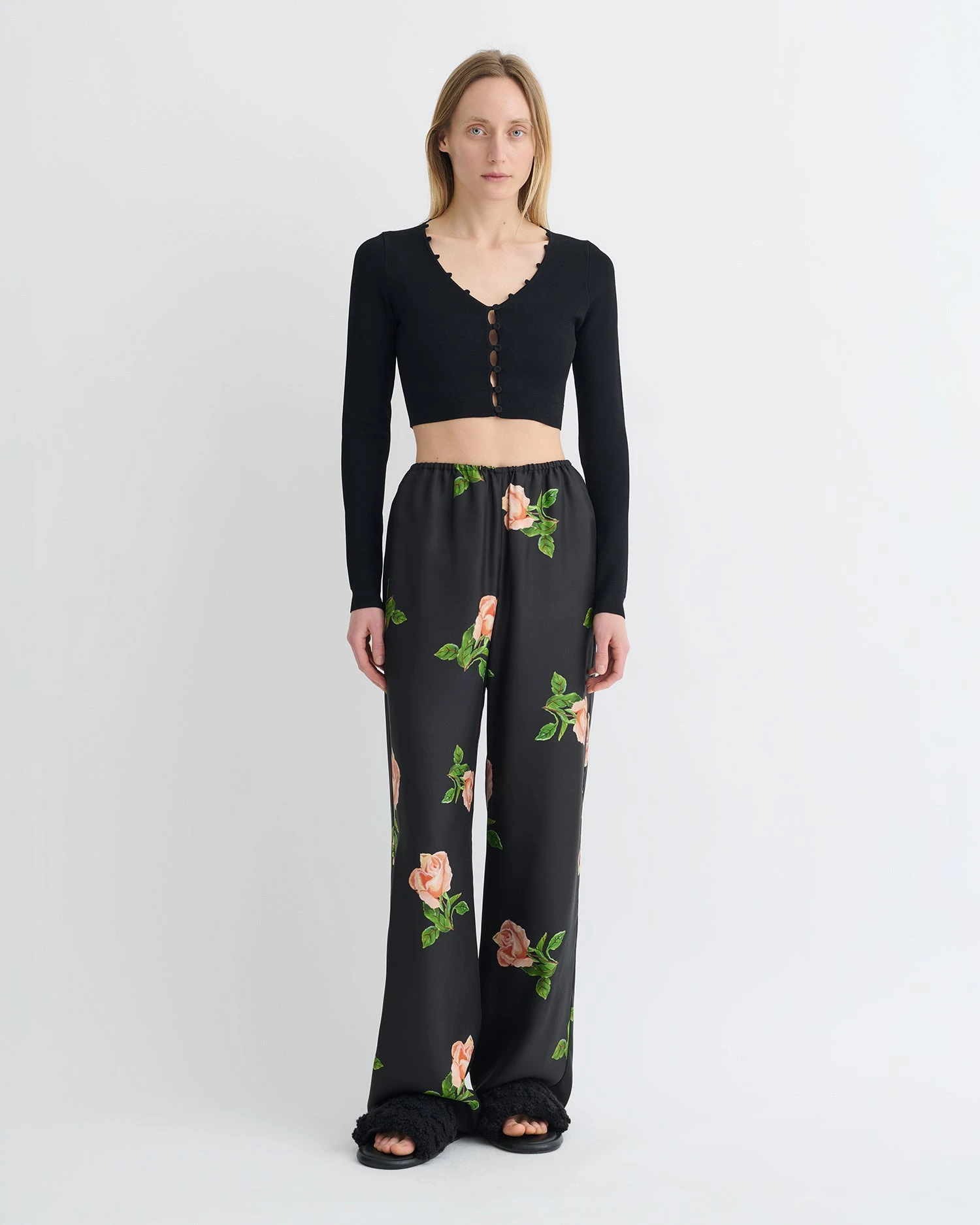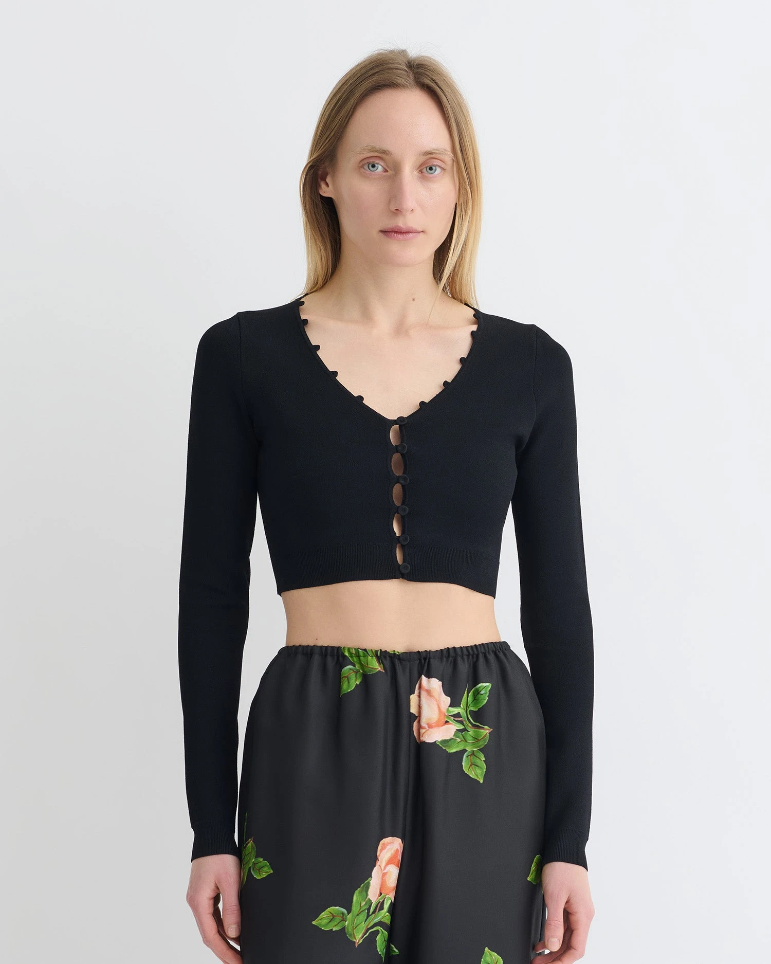The Dovie cardigan combines timelessness with a contemporary shape. Knitted from smooth compact viscose, it has a streamlined cropped silhouette and looped button fastenings.