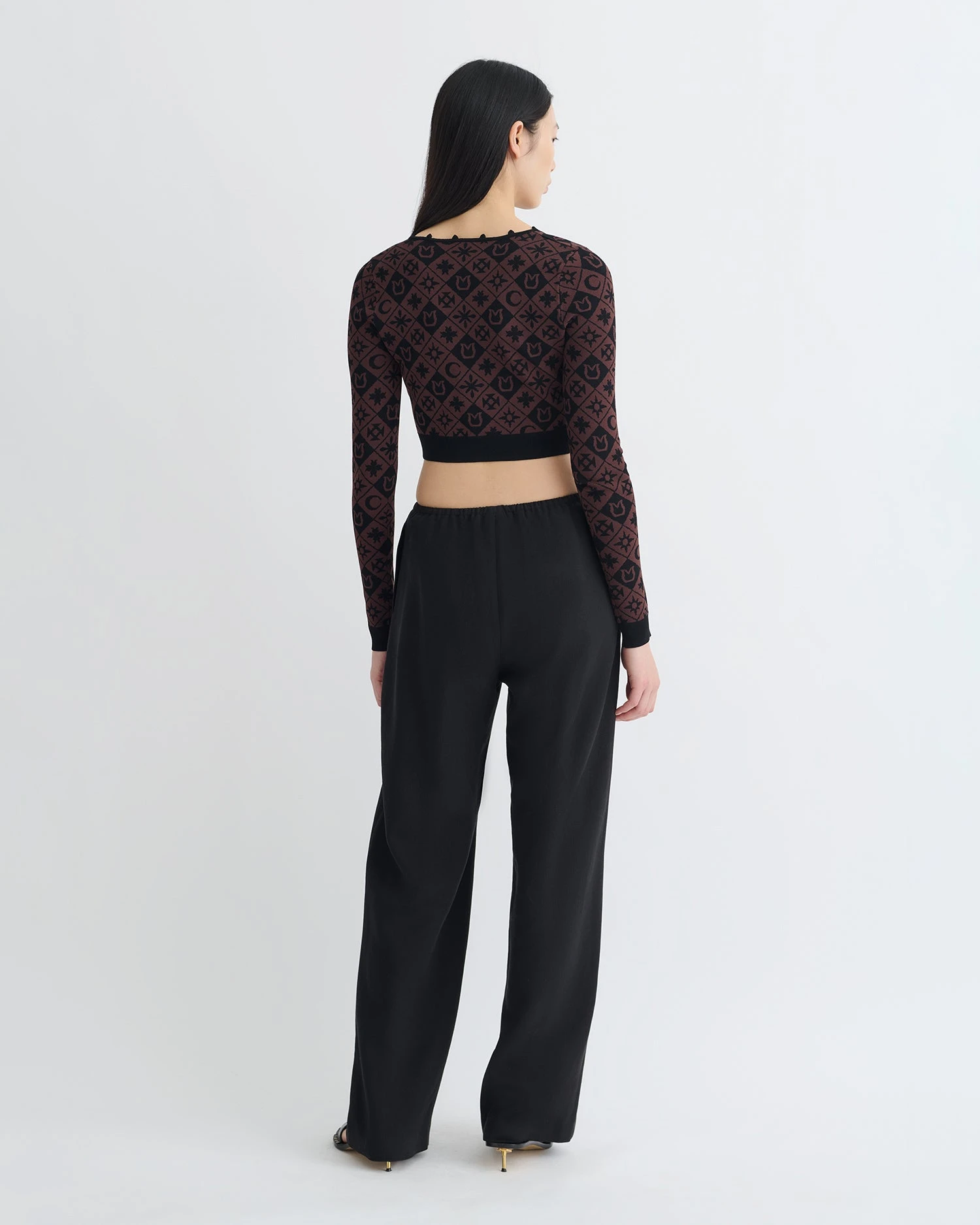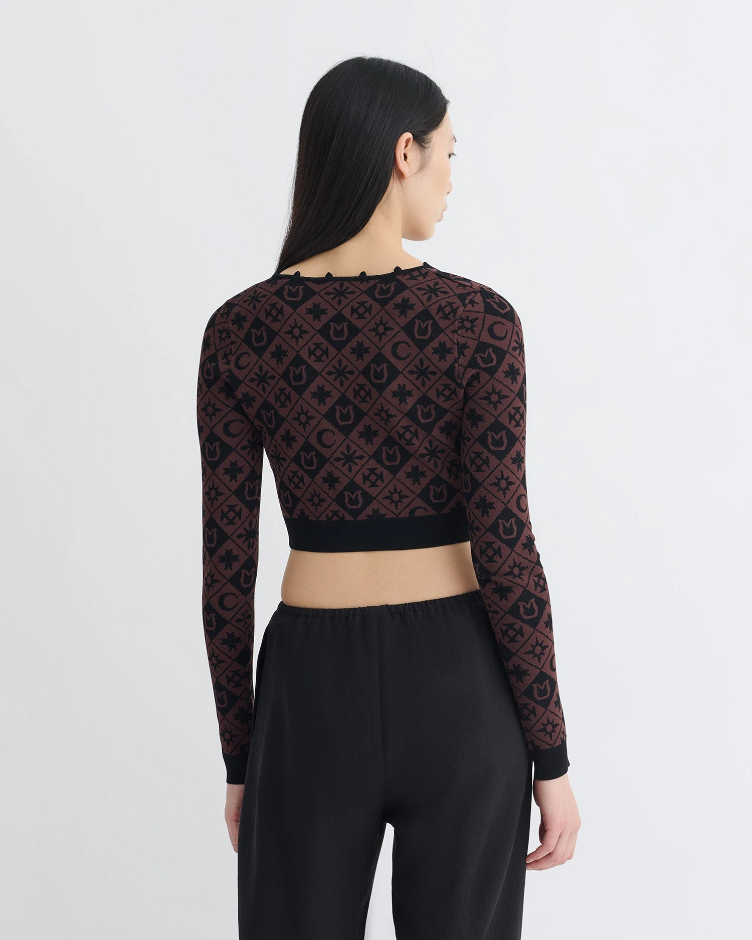 The Dovie cardigan combines timelessness with a contemporary flair. Knitted from smooth compact viscose, it has a streamlined cropped silhouette, looped button fastenings and striking Symbol Tile pattern.