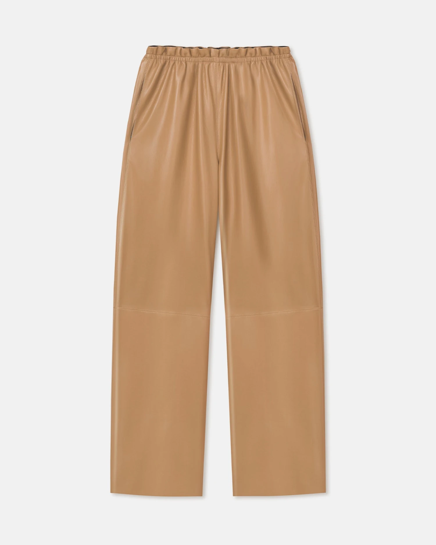 The Geb pants are made from our innovative Okobor™ alt-leather that’s gathered along the high waist. They fall to the floor in relaxed legs and come in a rich oak tone.
