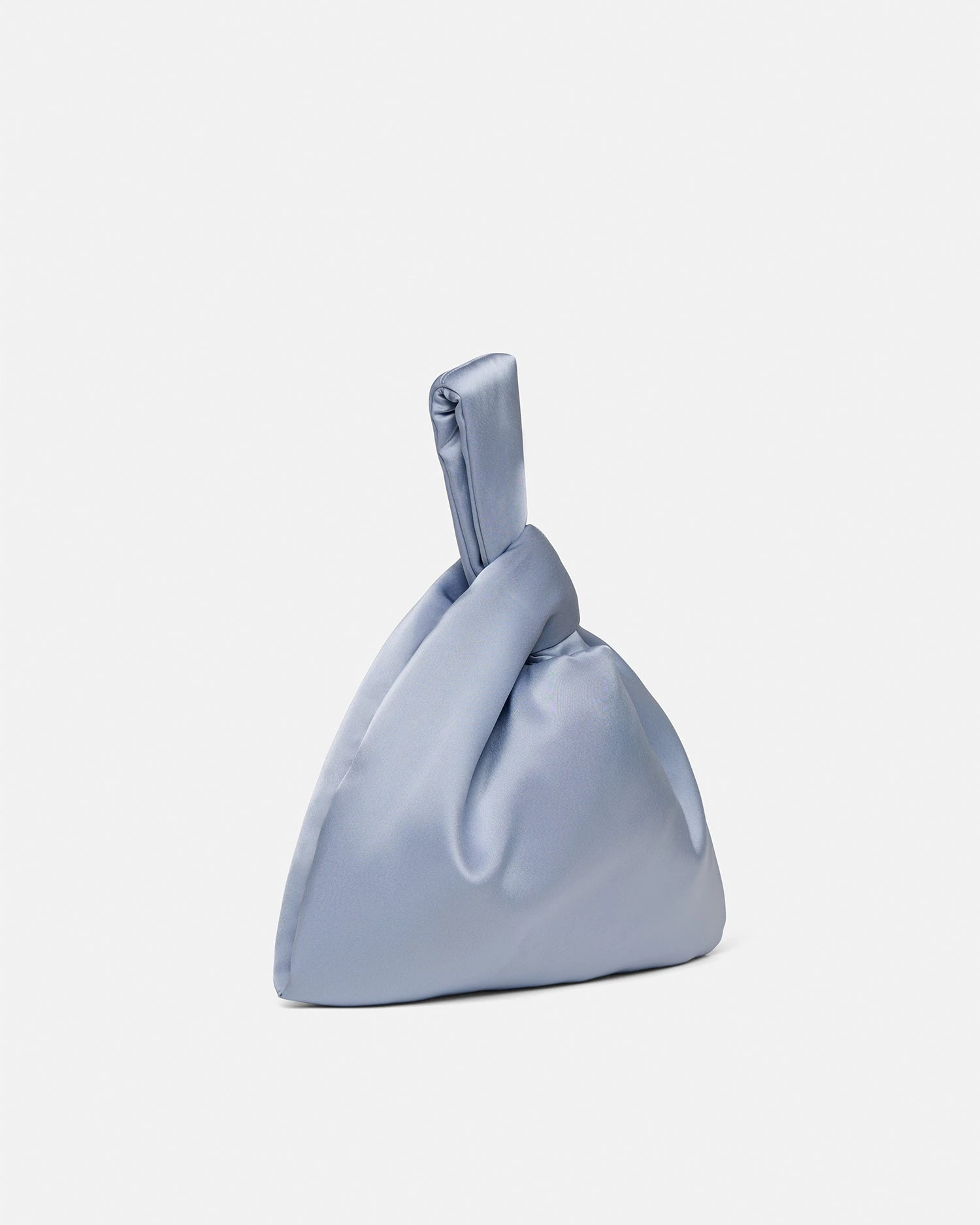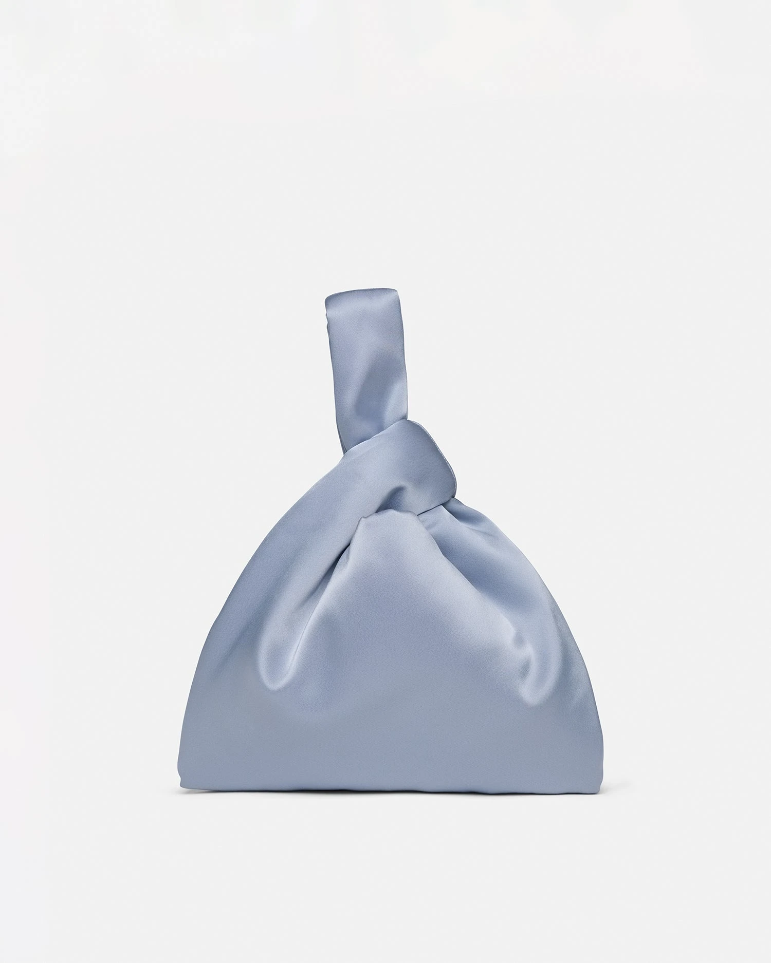 We continually look to update our hero pieces through material innovation and manipulation. This version of our Jen bag is crafted from satin in lustrous ice blue. With a slouchy triangular shape and looped wrist-strap, it is perfectly sized for evening essentials.