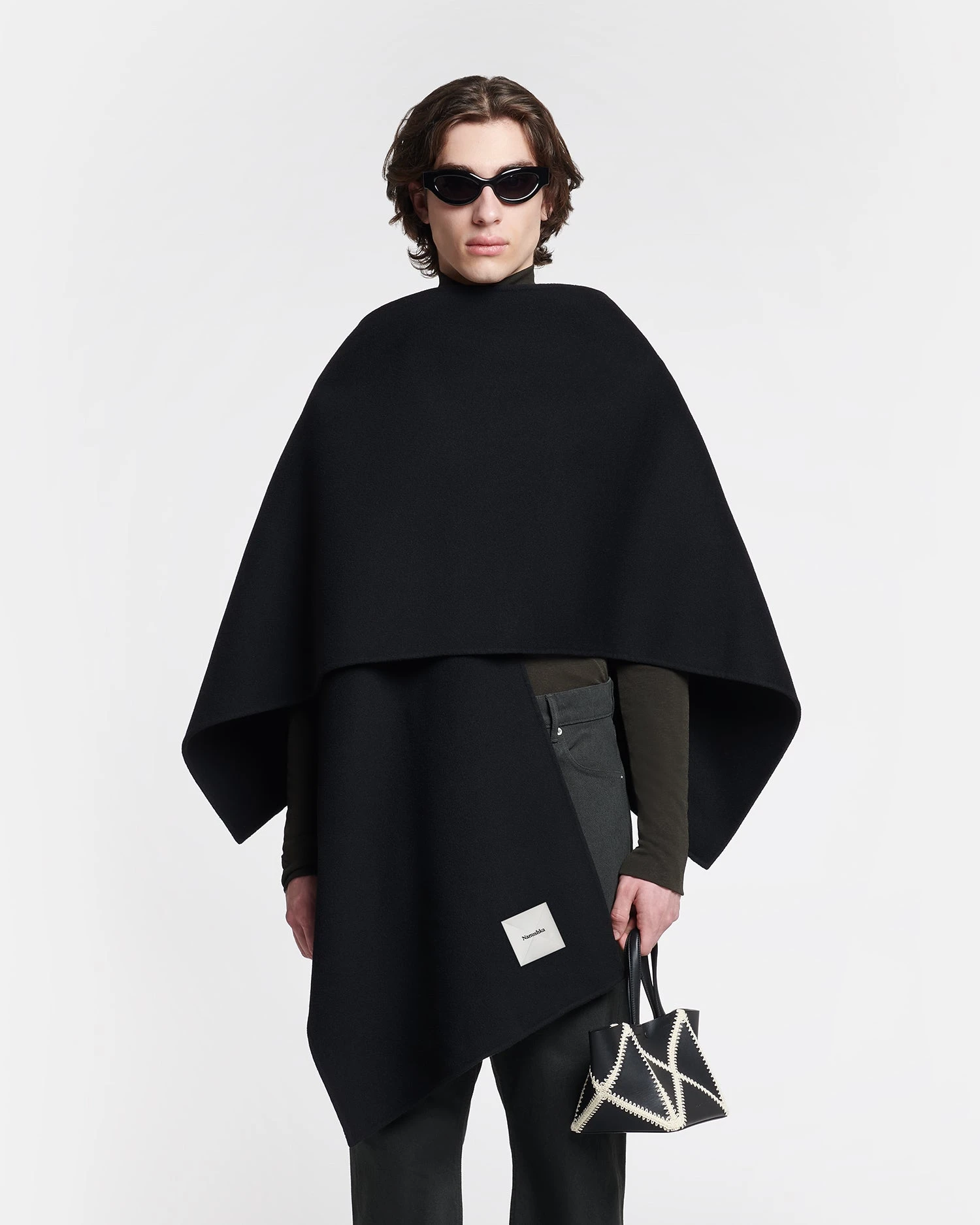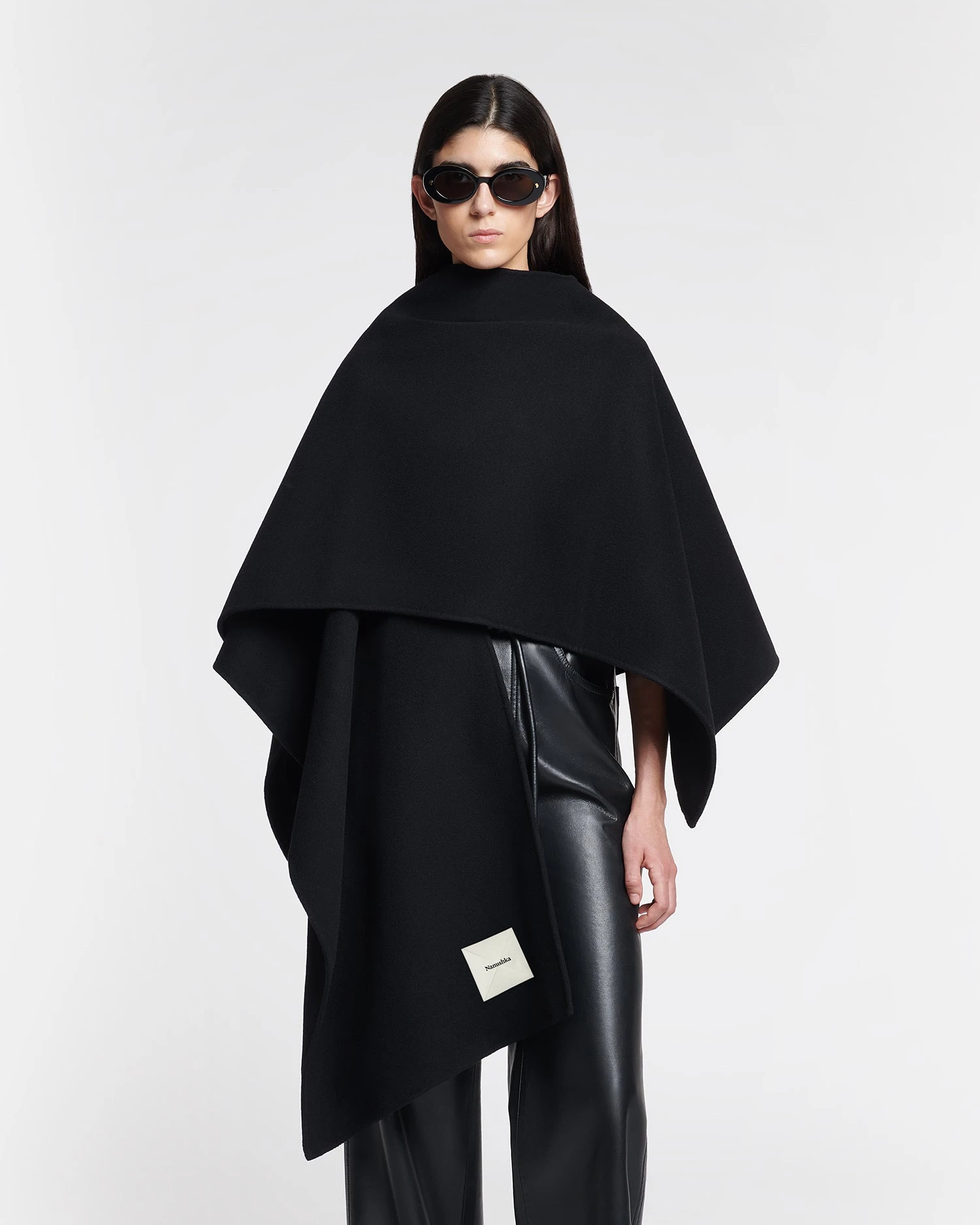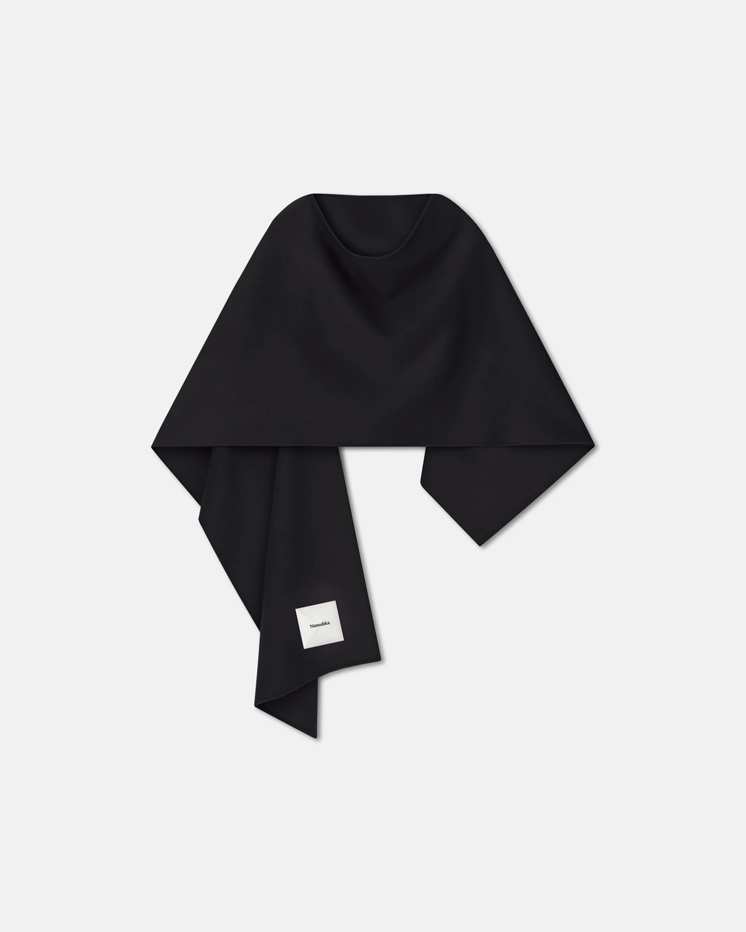 The Kamin shawl is made from a blend of wool and silk in a tonal black hue, offering timeless luxury.