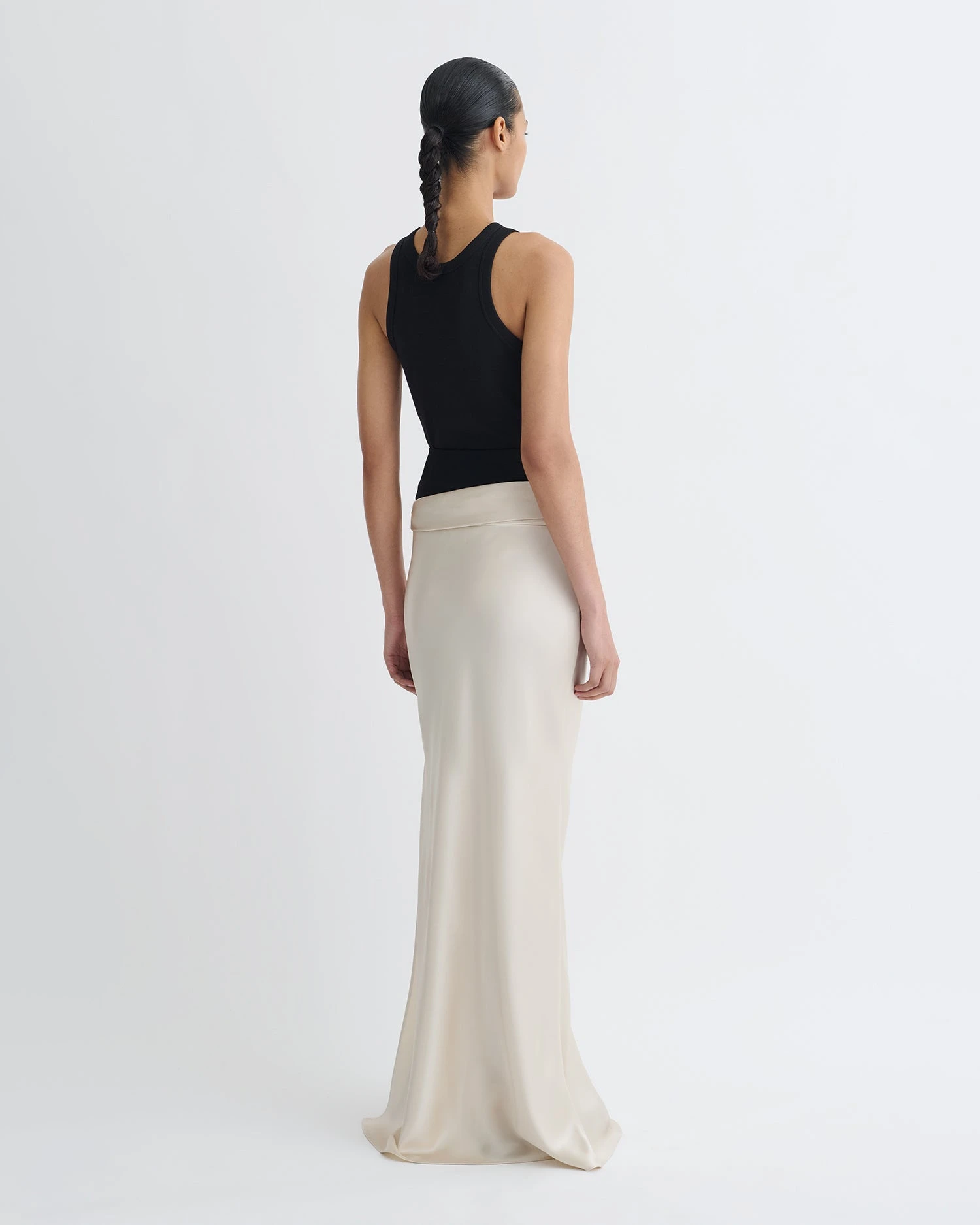 We love fabric blocking for the way it balances ease with elegance. The Letto dress is made up of a black mesh jersey waist and creme slip satin skirt ā the draped waist is super flattering.