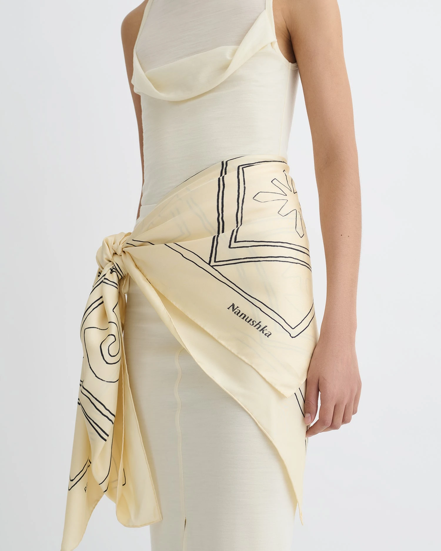 The Miani scarf is decorated with a Symbol Argyle print, an array of motifs inspired by traditional Hungarian kopjafa motifs. Made from silk, it can be styled endlessly, from around the neck and shoulders to looped round the handle of a tote.