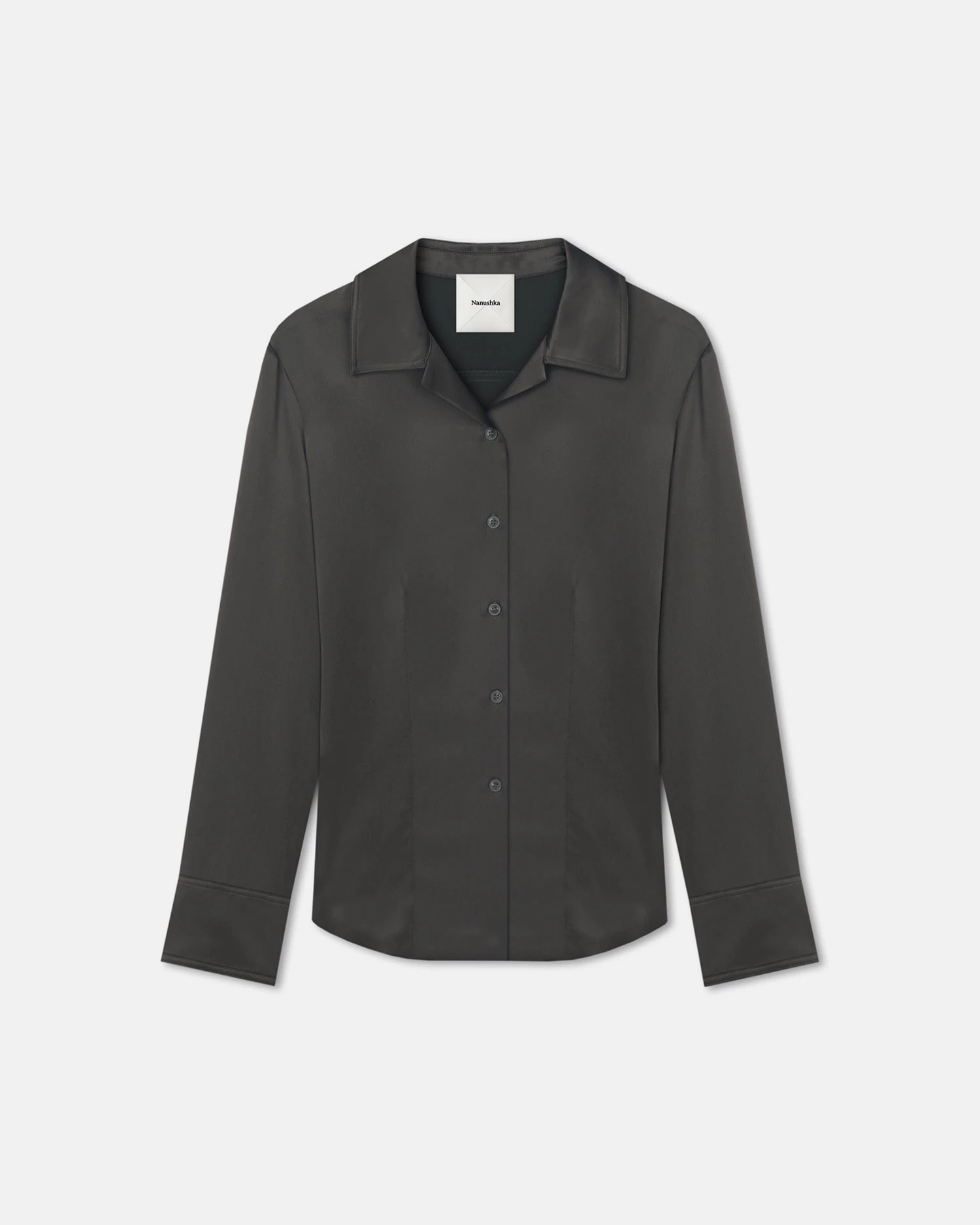 The Nathalie shirt is the definition of contemporary elegance. It’s made from our signature slip satin that hangs and drapes so fluidly. The dark-green hue is no less versatile than black.