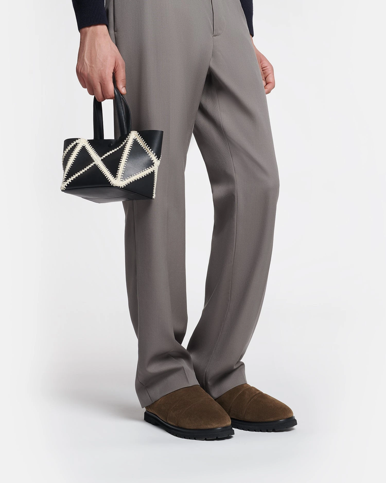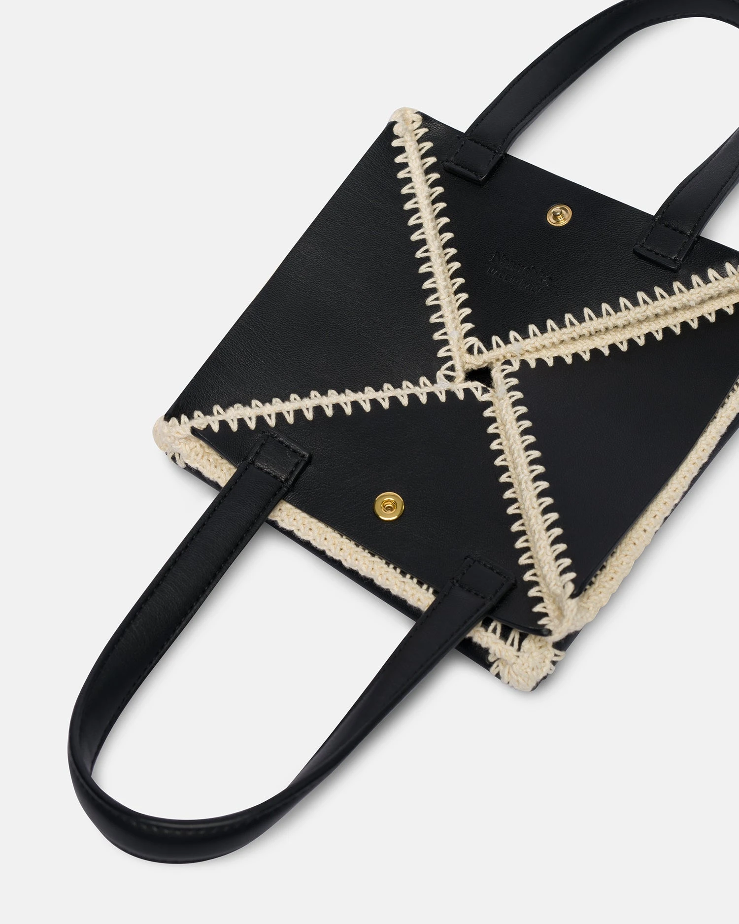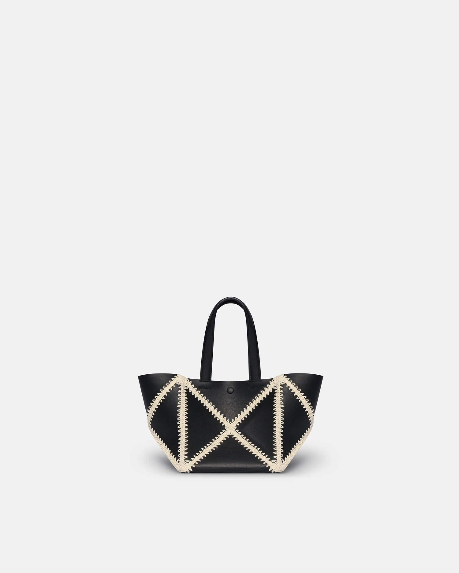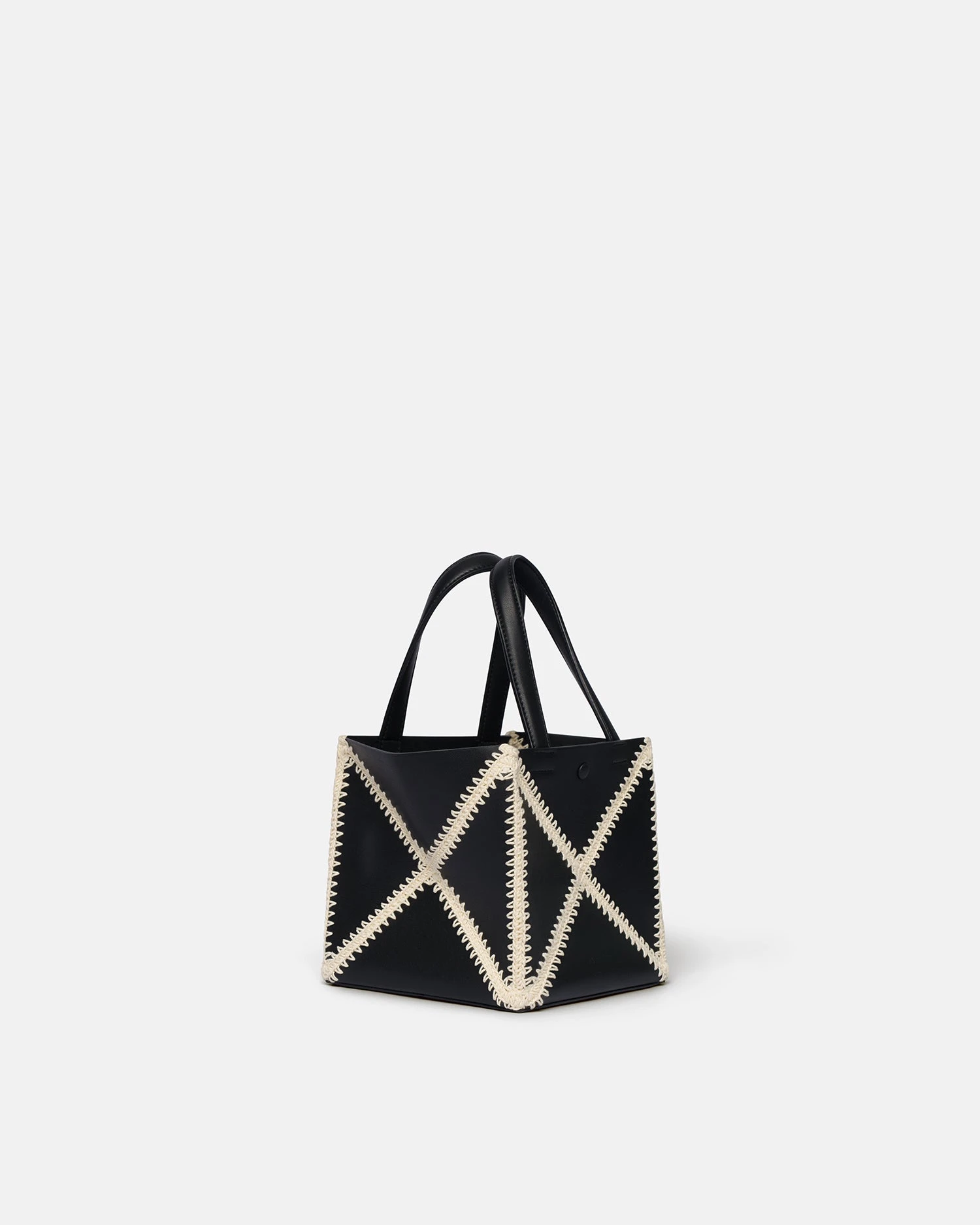 Origami tote folds completely flat to offer a functional solution for storing all your essentials with a long strap to wrap around the body. Now in a new mini size and crafted from soft patent alt-nappa, contrasting merrow stitch is used to create a patchwork effect.