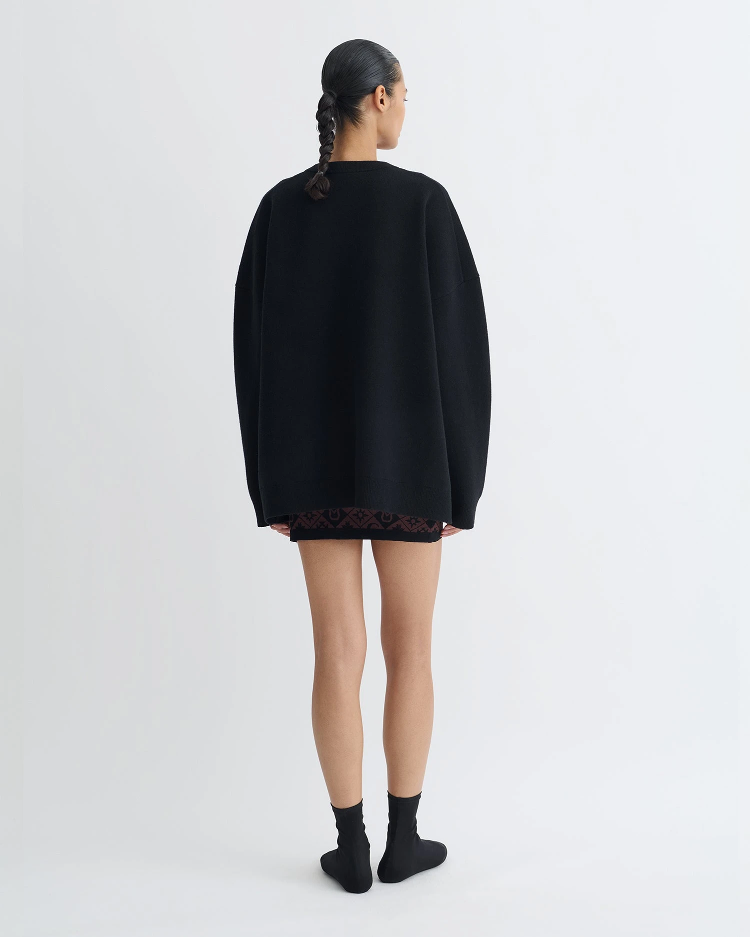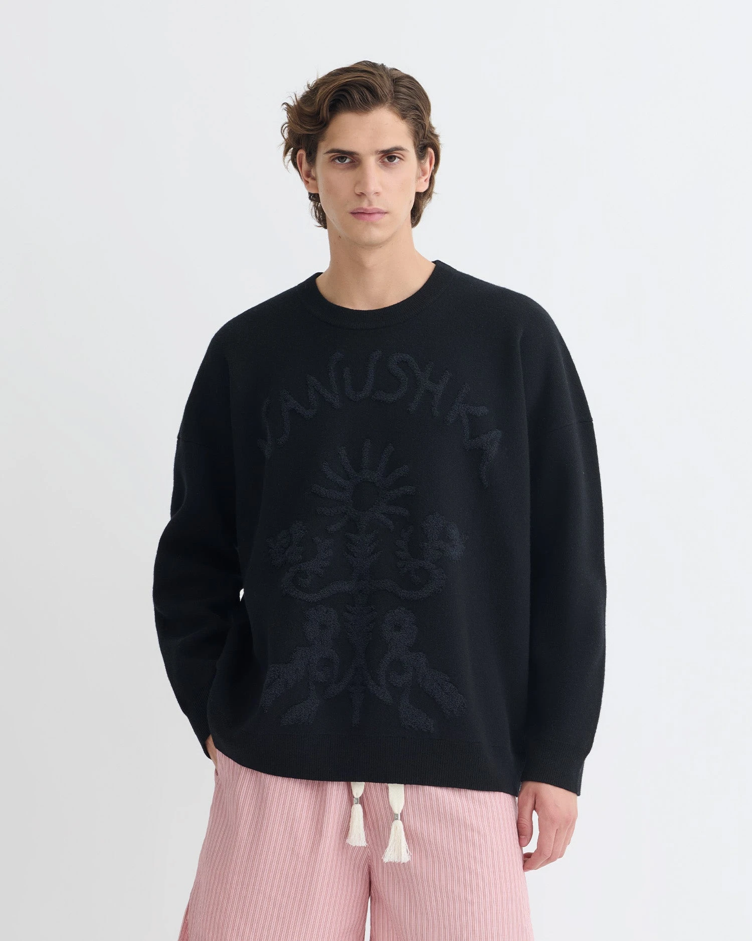 The Oswin sweater is jacquard-woven with the Nanushka logo and signature artful motifs in soft terry. It is knitted from merino wool for a louche, oversized fit.