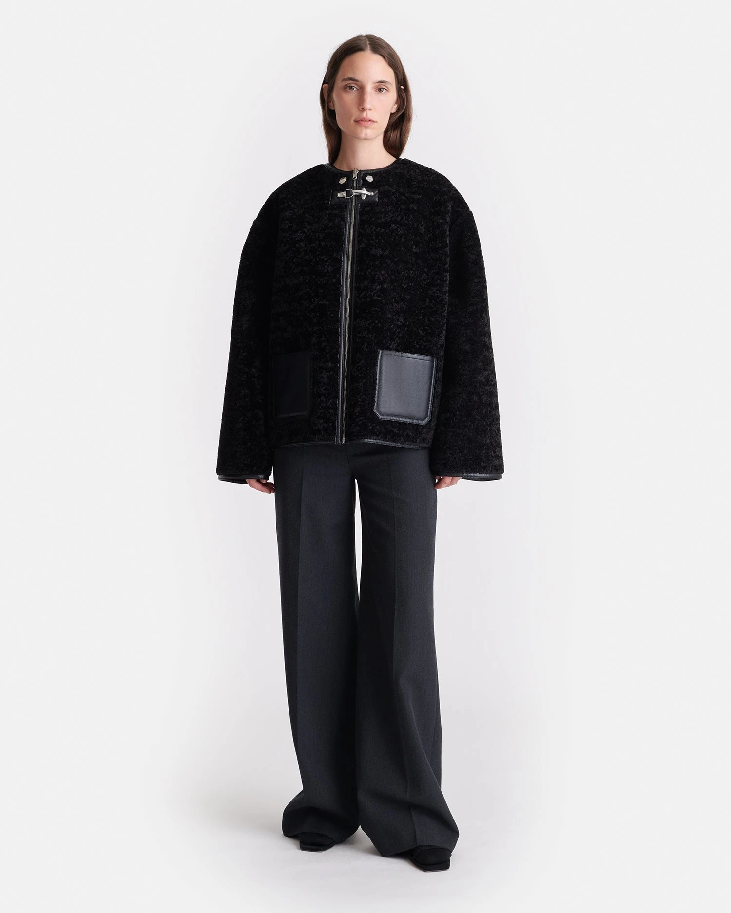 The Panka jacket is crafted from bonded shearling – switch between the smooth and textured sides for styling versatility. The hook and buckle fastenings and zip-up details reference classic Biker designs.