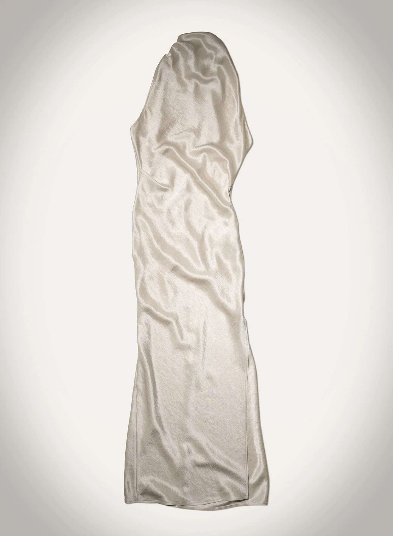The Peregrine dress is effortlessly elegant. Made entirely from upcycled washed satin, it falls beautifully from a high cowl neckline and is finished with a side split.
