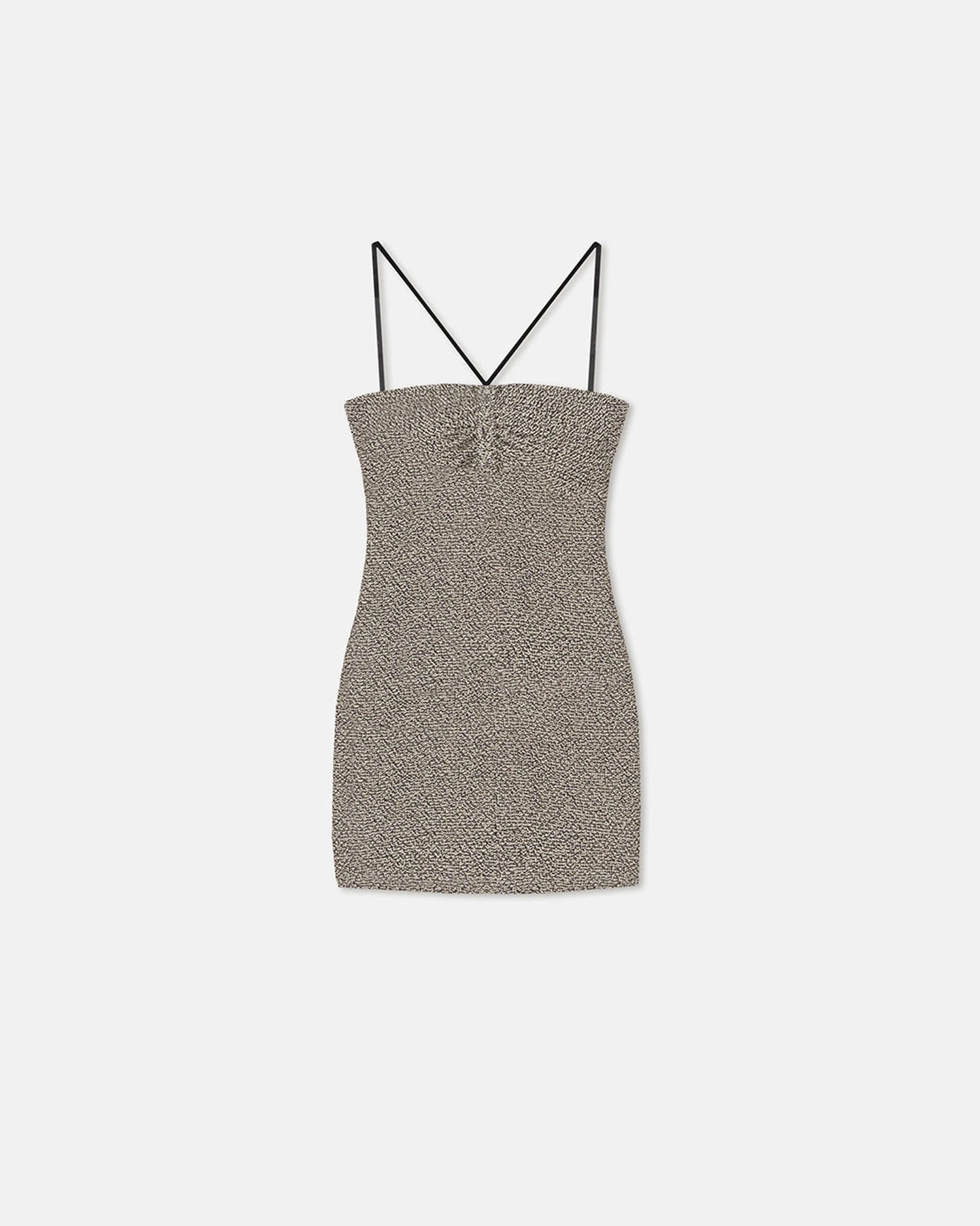 To mark our 20th anniversary, we experiment with new techniques such as fabric looping. The Rois dress is made from cotton with a looped texture, and is further distinguished by a black halter neckline and artful ruching.