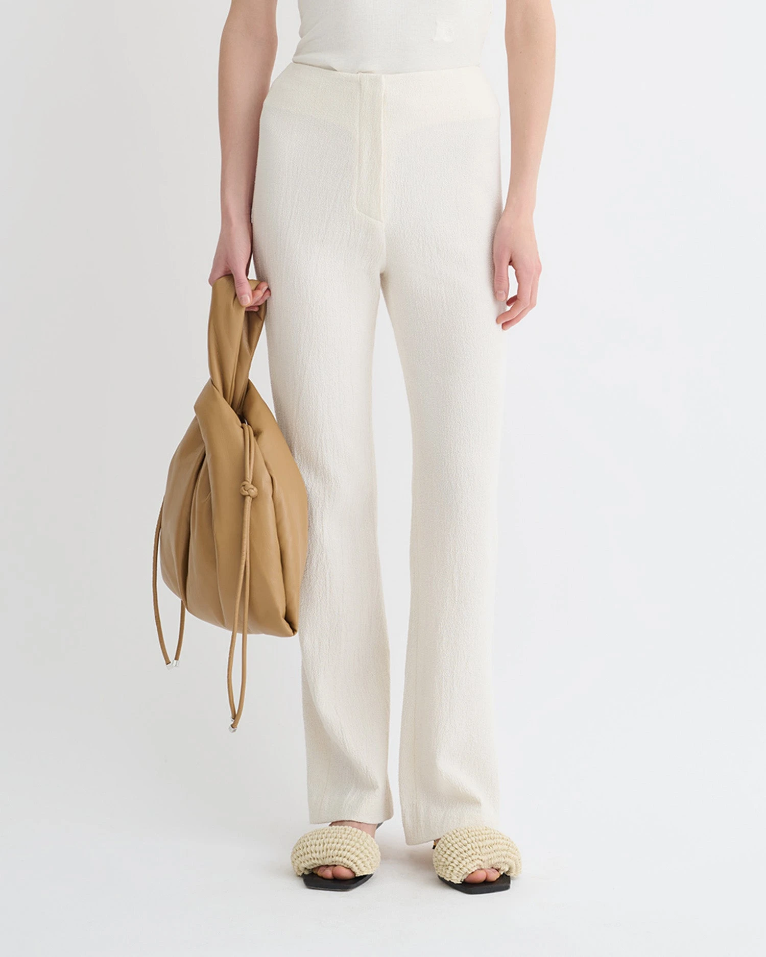 The Shera pants are an appreciation of simplicity. They are made from lightly textured crepe melange for a high-rise, slim-leg fit, and detailed with back slits for contemporary elegance.