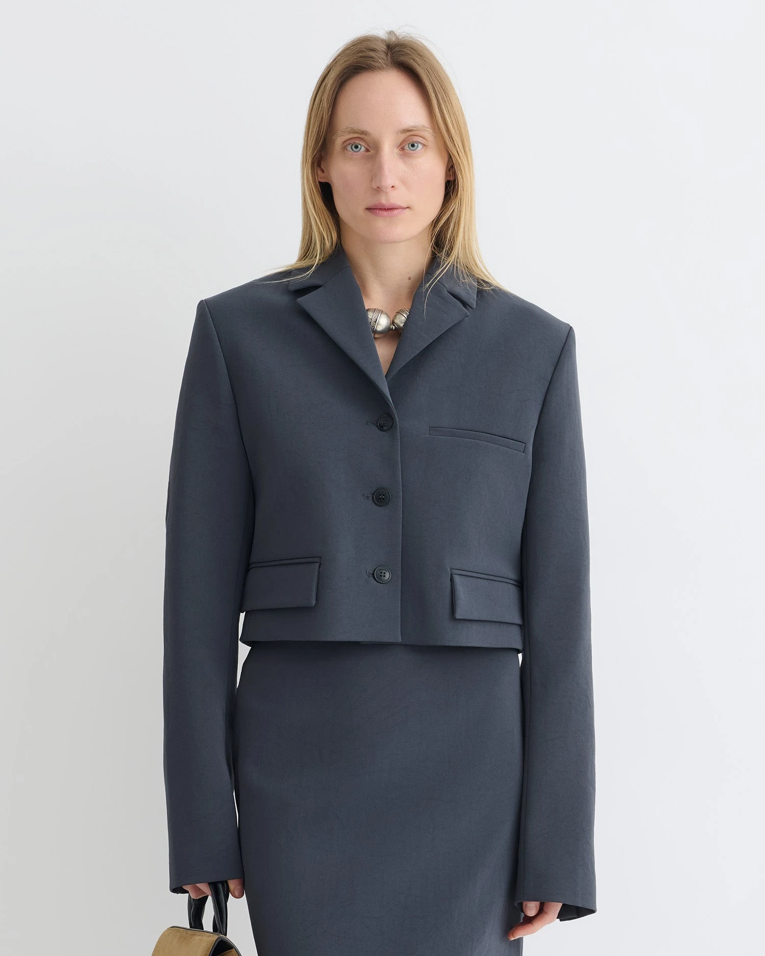The Sinead blazer showcases our contemporary approach to traditional tailoring. Made from lightweight paper jersey, it has a cropped boxy silhouette that’s the perfect counterpoint to streamlined separates.