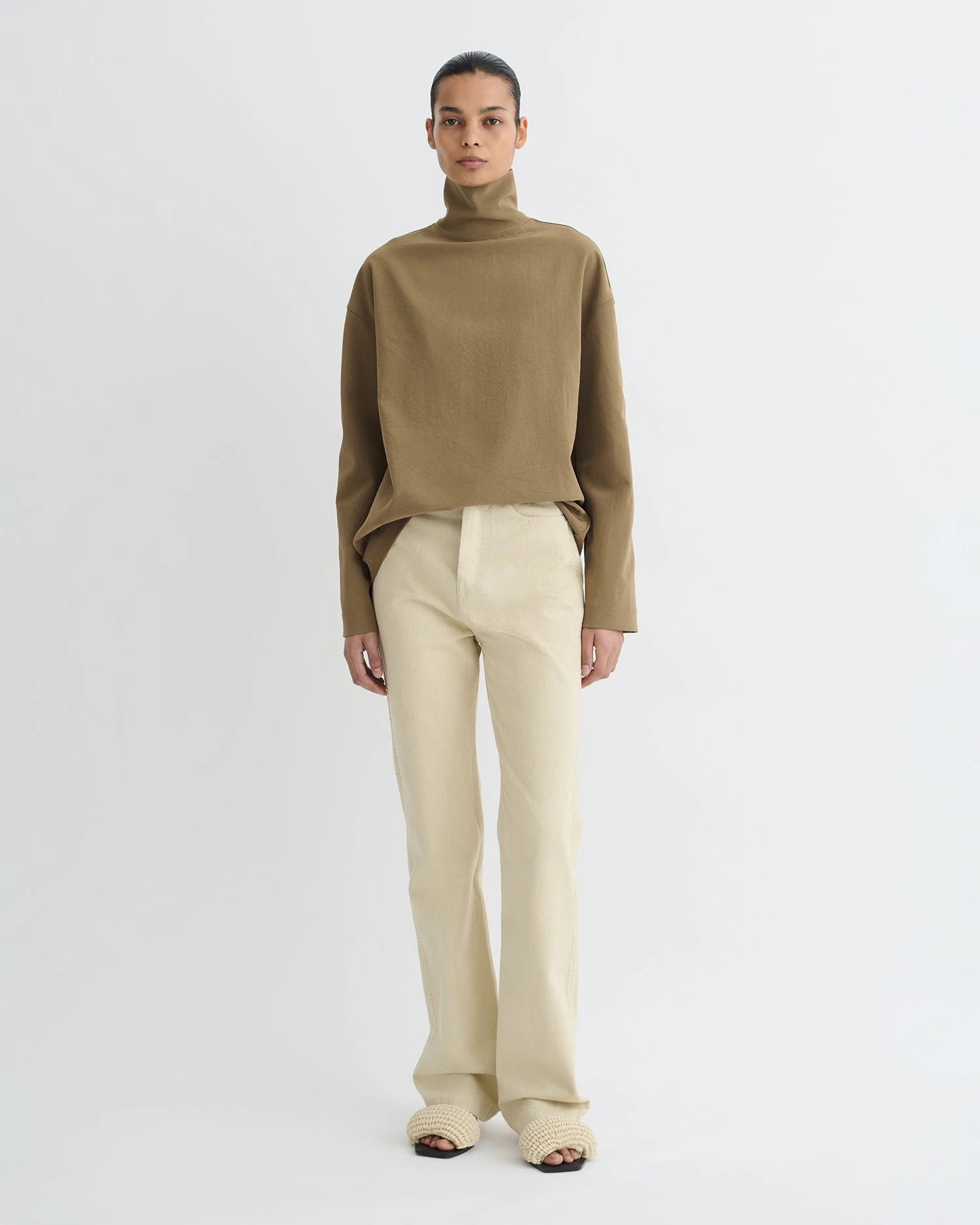 The Sitara top is made for understated sophistication. Cut from luxuriously lightweight paper jersey, it drapes fluidly from a chic turtleneck.