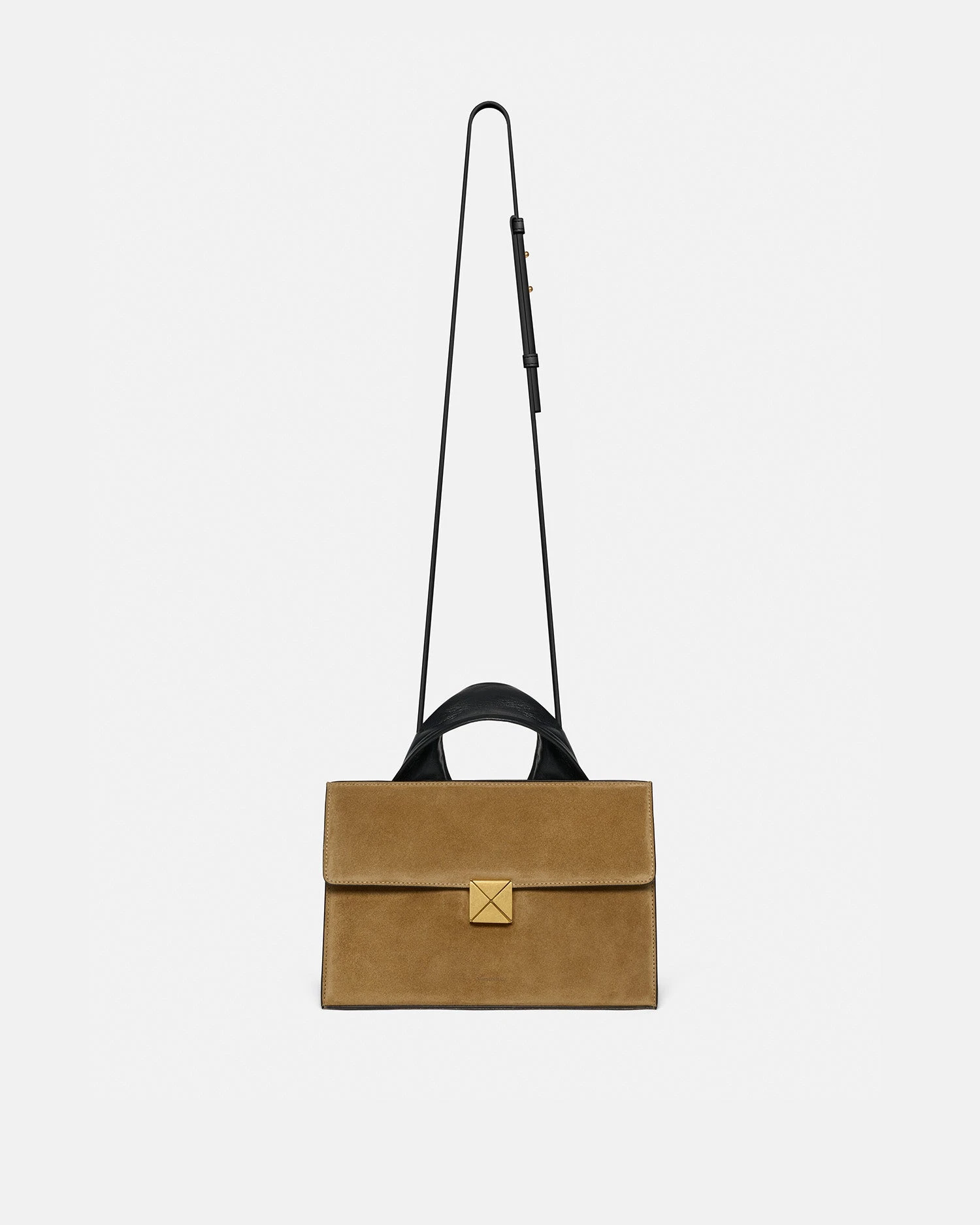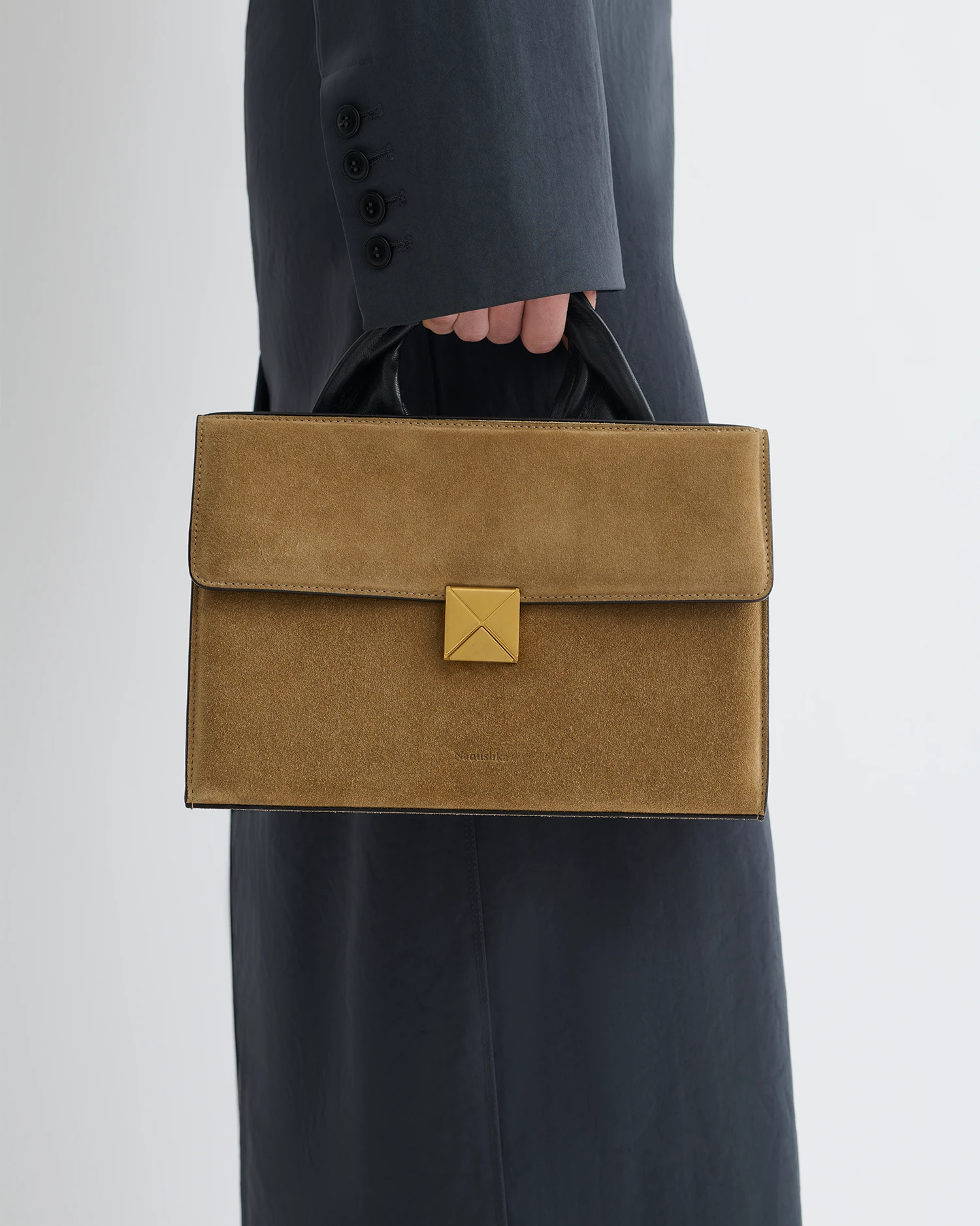 Designed from smooth suede in a rich brown, the SANDI Lock redefines what it means to be a modern bag. Completed with a moldable wire top handle and an adjustable cross-body strap, the in-house developed gold brushed origami lock sits at the heart of the bag, showcasing an integral piece of Nanushka’s geometrical brand code.